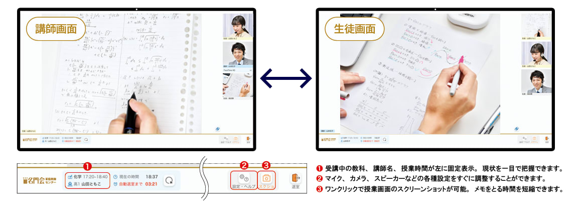 専用のオンラインシステムを用いることで、対面授業と同等の指導を実現しています。